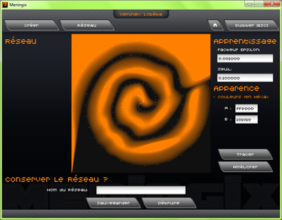 Le programme Meningix utilise le principe des réseaux de neurones pour modéliser un système en deux dimensions constitué de points pouvant représenter des courbes ou bien des formes (identifiées par une couleur spécifique).